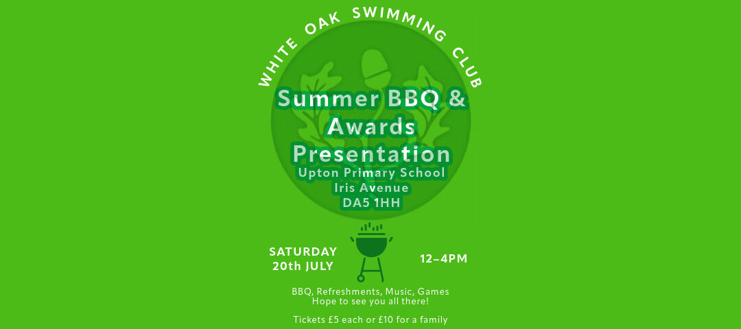 The White Oak Swimming Club BBQ & Awards Presentation will take place on Saturday 20th July between 12 & 4pm at Upton Primary School, Iris Avenue, DA5 1HH. Please save the date. Information on how to purchase a ticket will be available soon. Hope to see you...